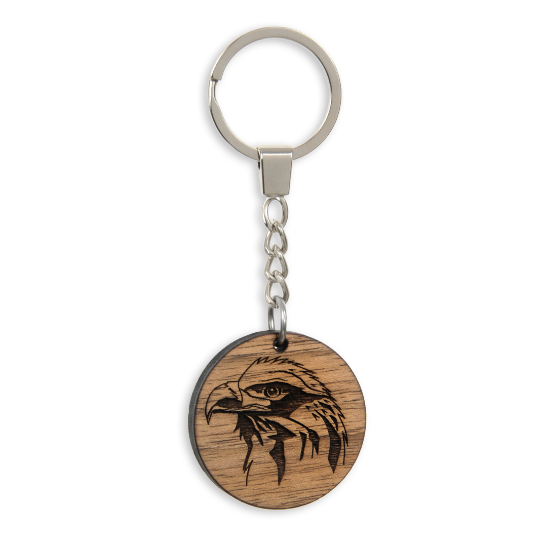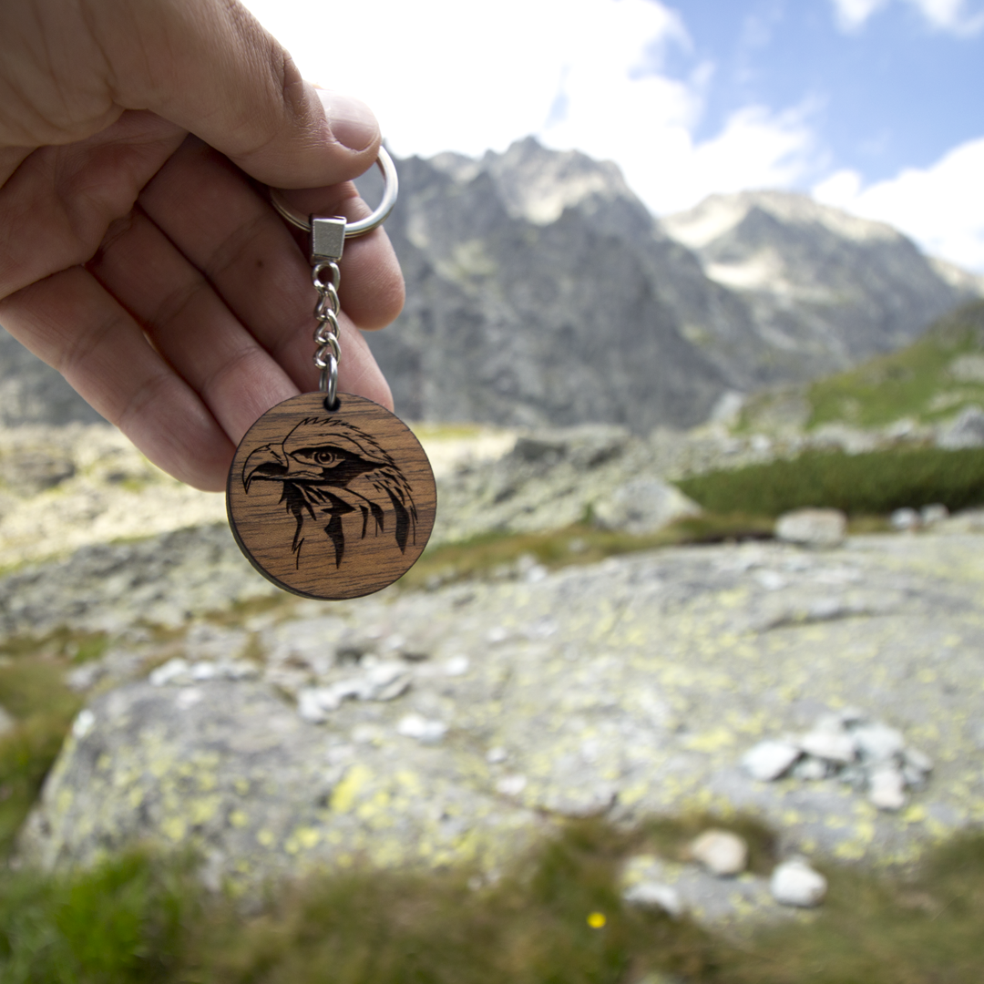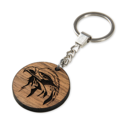 Okrągły brelok drewniany z wygrawerowanym wizerunkiem orła. Może służyć jako breloczek do kluczy lub oryginalna ozdoba, którą można przypiąć do ubrania, torebki czy plecaka. Dzięki zgrabnym, niewielkim rozmiarom, wisiorek jest lekki, praktyczny i bez problemu zmieści się w kieszeni. Brelok wykonany jest z kawałka drewna orzechowego, co zapewnia mu dużą trwałość, niepowtarzalne wybarwienie i unikalny klimat. Breloczek dosłownie pachnie lasem.