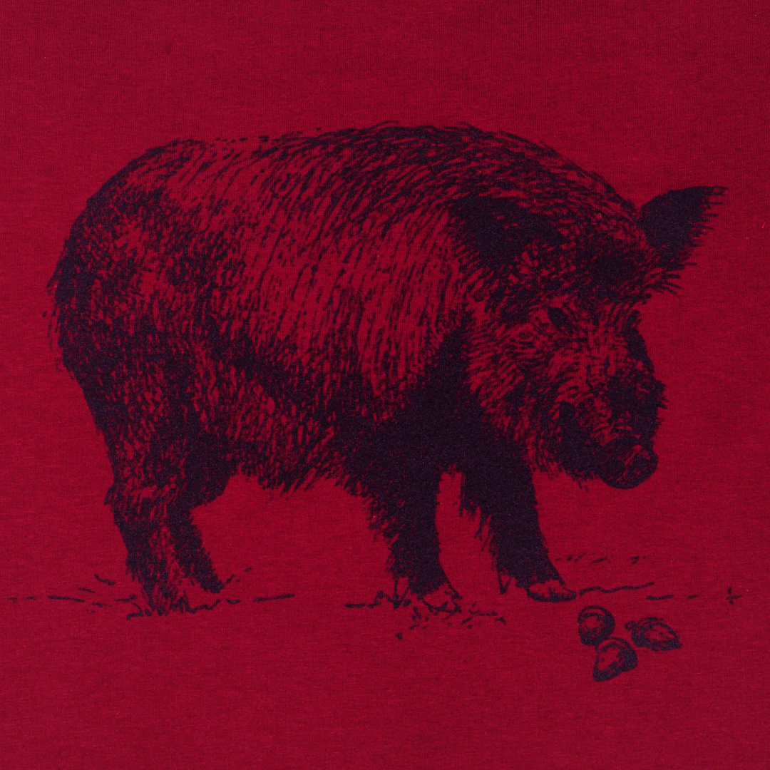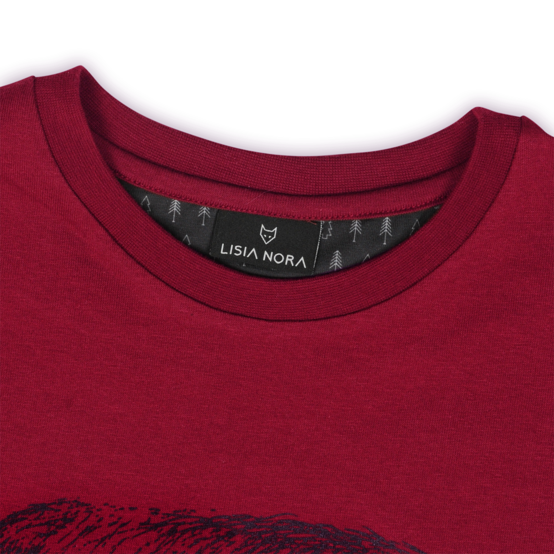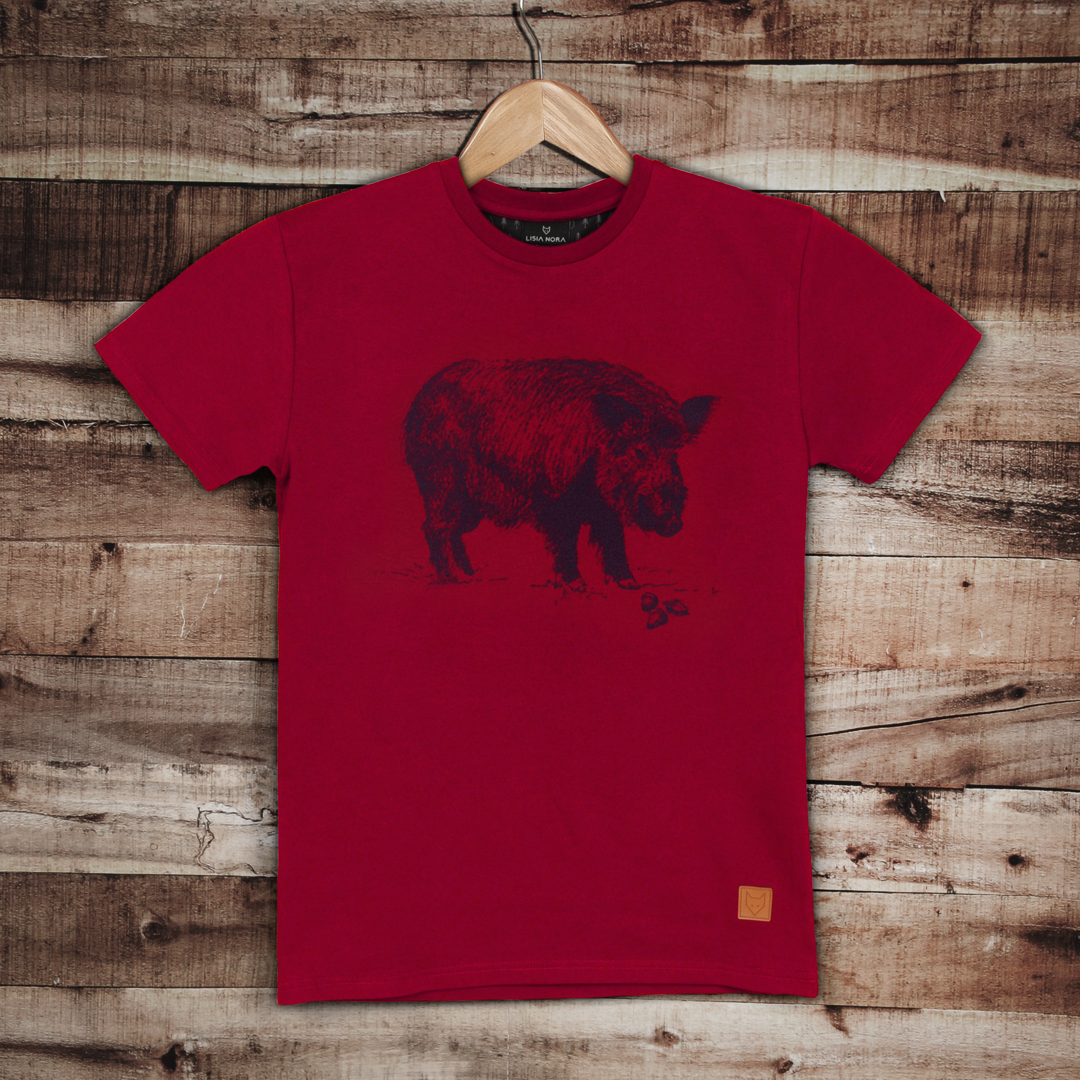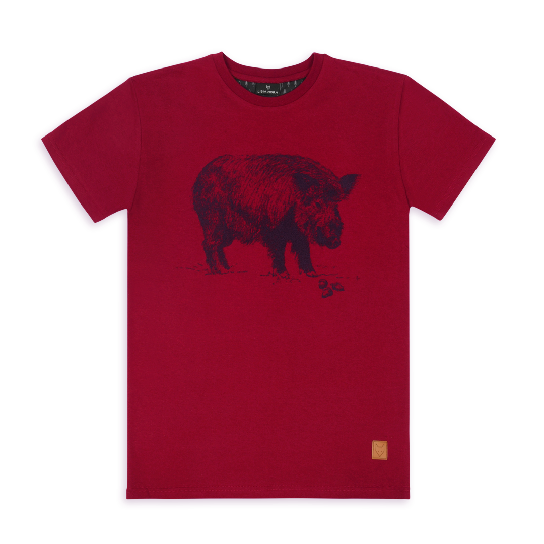 Koszulka bawełniana z dzikiem, w kolorze jasnobordowym. Idealna dla miłośników dzikiej przyrody, bliskiego kontaktu z naturą i aktywnego spędzania wolnego czasu. T-shirt uszyty jest z bawełny o gramaturze 180g/m2, co zapewnia wysoką jakość produktu pomimo jego lekkości. Nadruk wykonany został metodą sitodruku, dzięki czemu jest trwały i wyrazisty, a zarazem miękki i oddychający. Koszulka została w całości zaprojektowana i uszyta w Polsce.