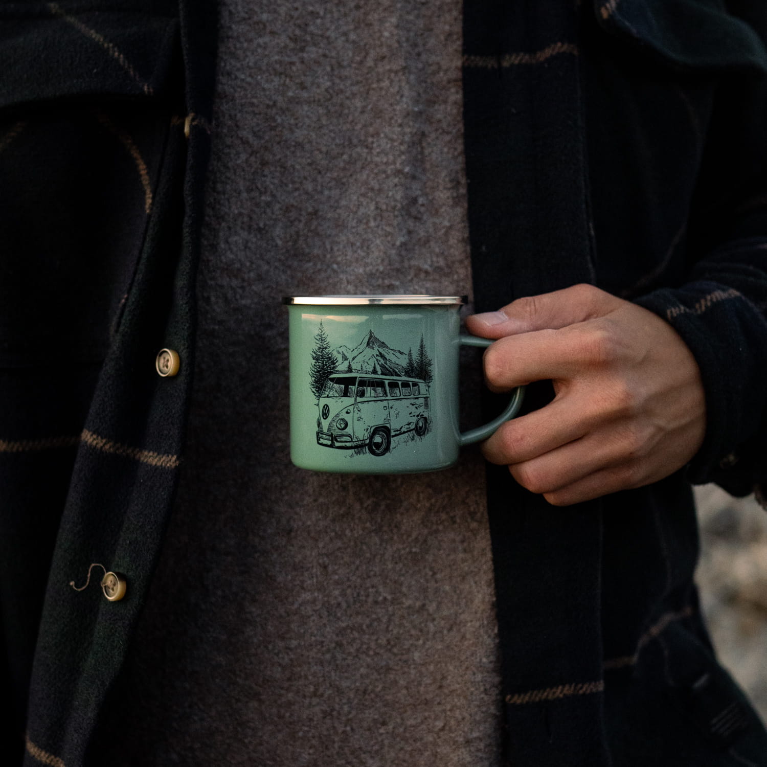 Kubek emaliowany o pojemności 330 ml z ilustracją przedstawiającą legendarnego VW Transportera na tle górskich szczytów. Po przeciwnej stronie grafiki umieściliśmy stylizowany napis „Vanlife”, nawiązując do rosnącego trendu wśród kamperowców i entuzjastów przebywania na łonie natury.