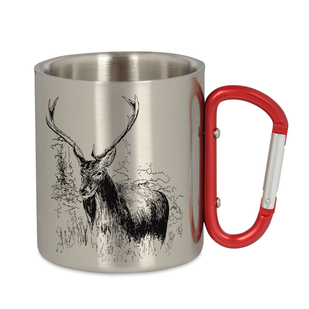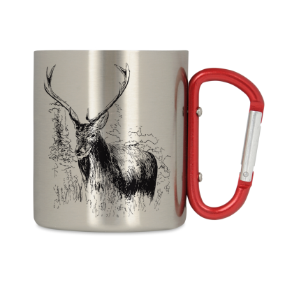 Kubek metalowy o pojemności 300 ml z jeleniem szlachetnym. Jeleń to prawdziwy król puszczy. Jest jednym z największych ssaków kopytnych występujących w Polsce. Głowę samca jelenia (czyli byka) zdobi noszone z dumą poroże, które zrzuca on każdej wiosny. Na jego miejscu wyrasta nowe, z każdym rokiem jeszcze okazalsze. Oręż ten jest wykorzystywany w okresie godów (tzw. rykowiska), w rywalizacji o uznanie łań.