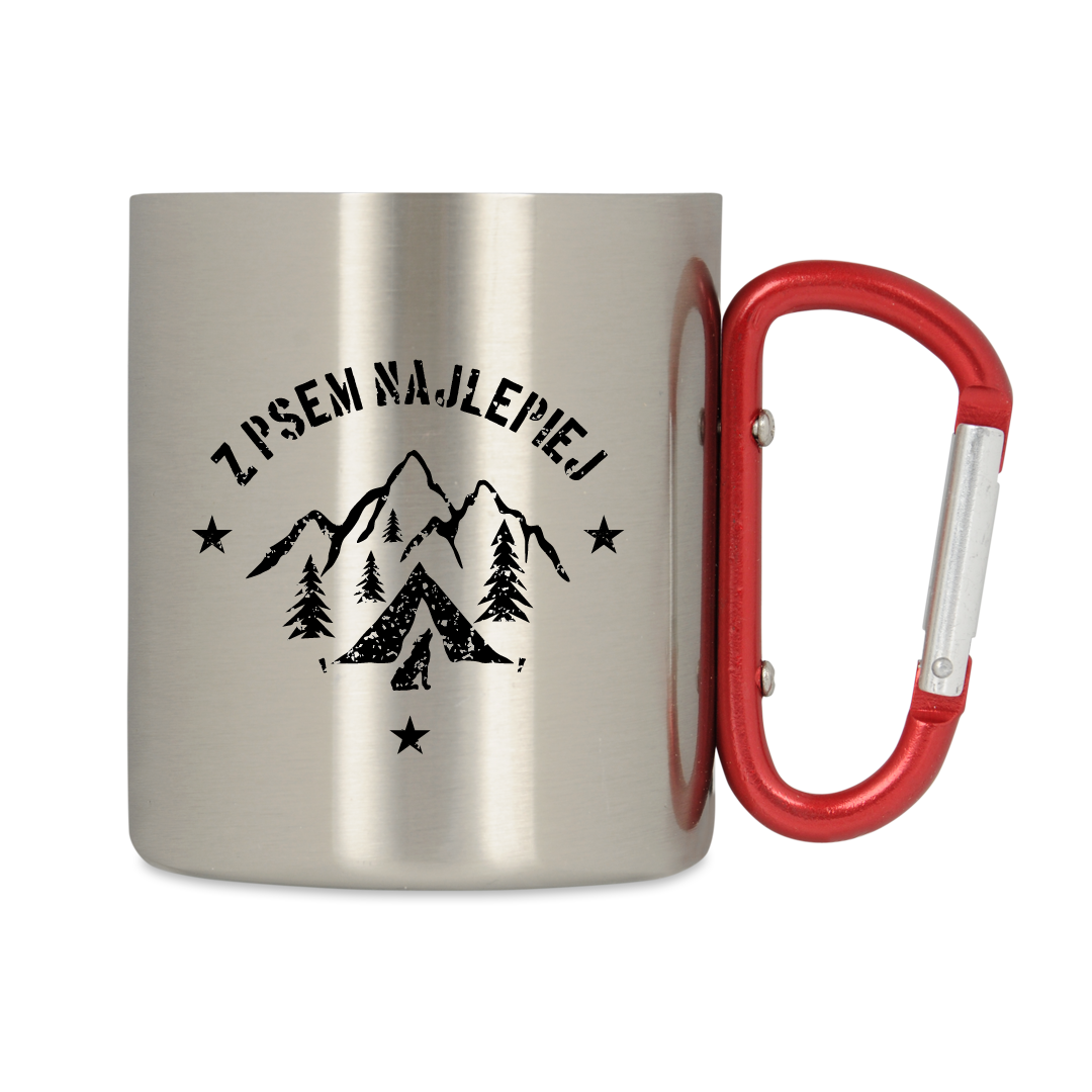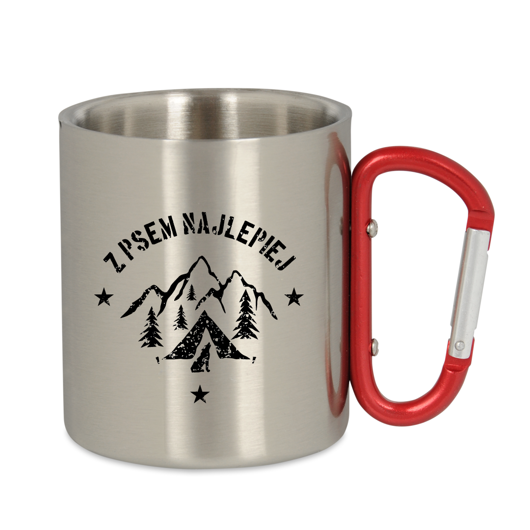 Kubek wyposażony jest w uchwyt typu karabińczyk oraz podwójne metalowe ścianki, dzięki czemu jest jeszcze bardziej wytrzymały. Czerwona klamra umożliwia przypięcie kubka do paska lub plecaka, dzięki czemu nie zajmuje on niepotrzebnie miejsca wewnątrz. Kubek z karabińczykiem to niezbędne wyposażenie każdego górskiego wędrowca, lecz także świetny pomysł na prezent.