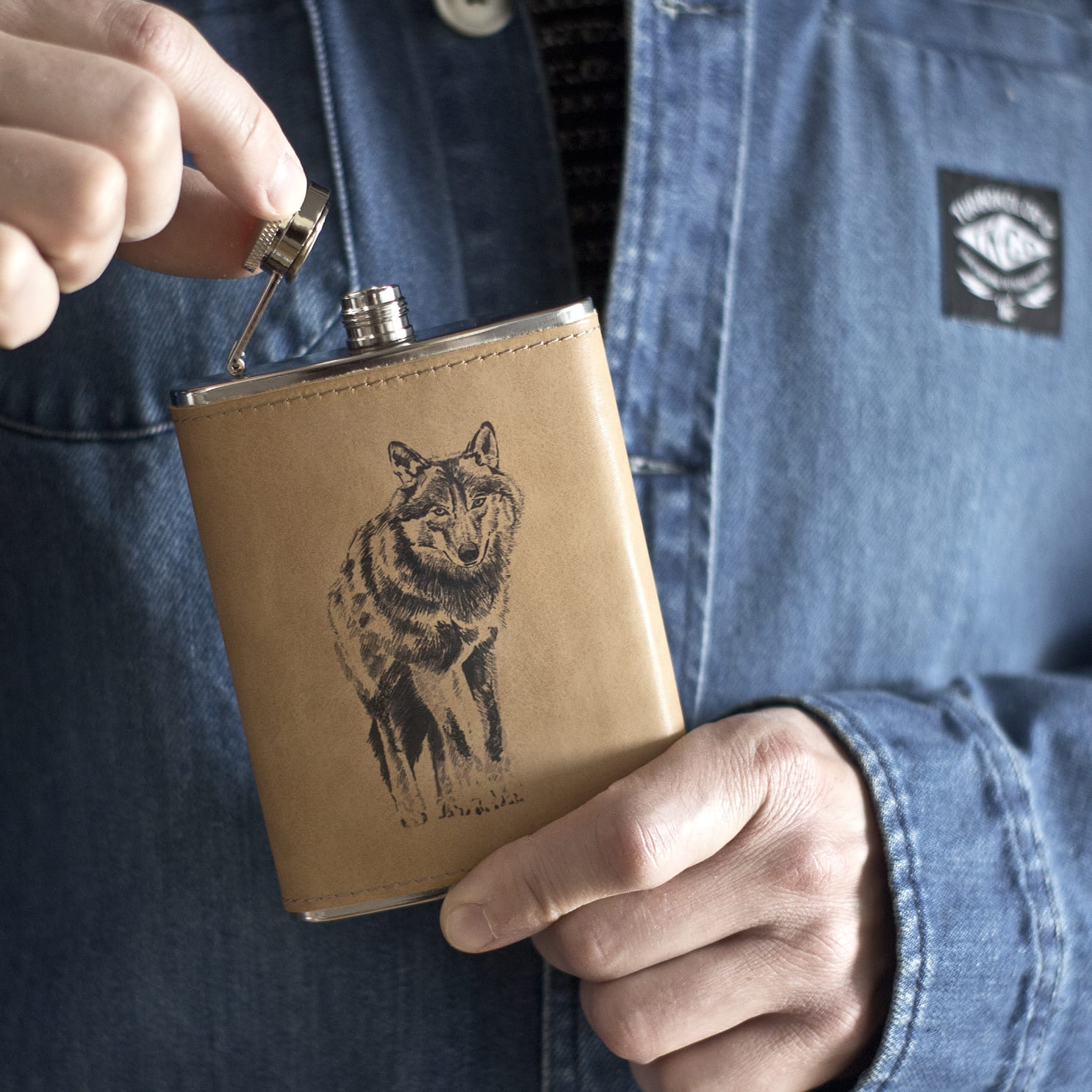 Stalowa piersiówka z wizerunkiem wilka, oprawiona w jasnobrązową ekoskórę. Autorem ilustracji zdobiącej produkt, jest polski projektant: Tomasz Kosarzecki. Wilk szary, wraz z rysiem i niedźwiedziem, należy do trzech największych drapieżników występujących w Polsce. Jest ściśle chroniony.