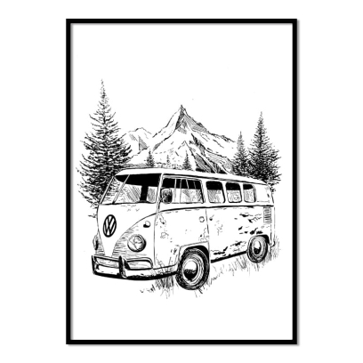 Czarno-biały plakat dekoracyjny z rysunkiem przedstawiającym legendarnego VW Transportera, na tle górskiego krajobrazu. Klasyczny motyw graficzny w naszej interpretacji. Projekt stworzyliśmy nie tylko dla wyznawców trendu „vanlife”, ale też dla wszystkich kochających przygody, podróże i ładny design. Autorem grafiki na plakacie jest polski projektant: Tomasz Kosarzecki. Produkt można zamówić w formacie A3, A2 i A1.