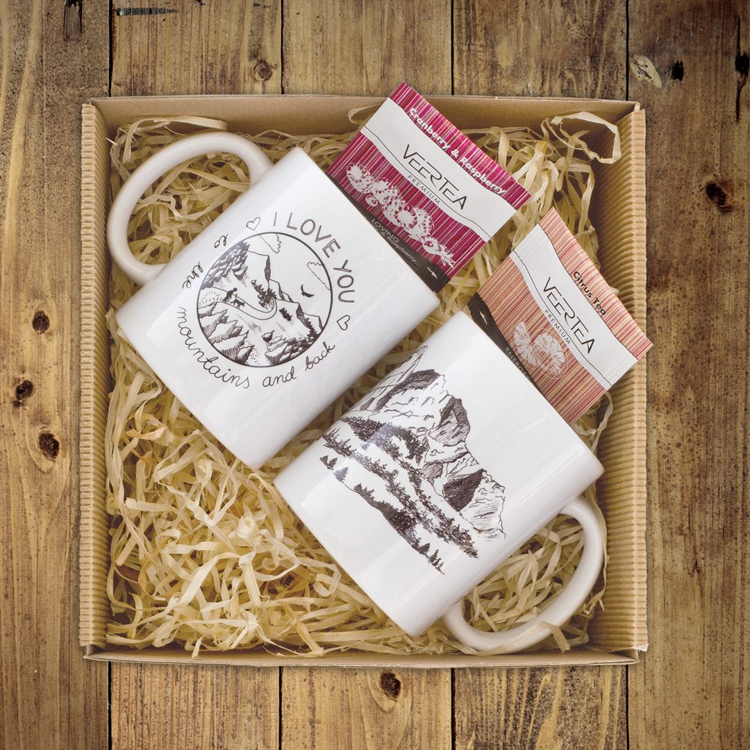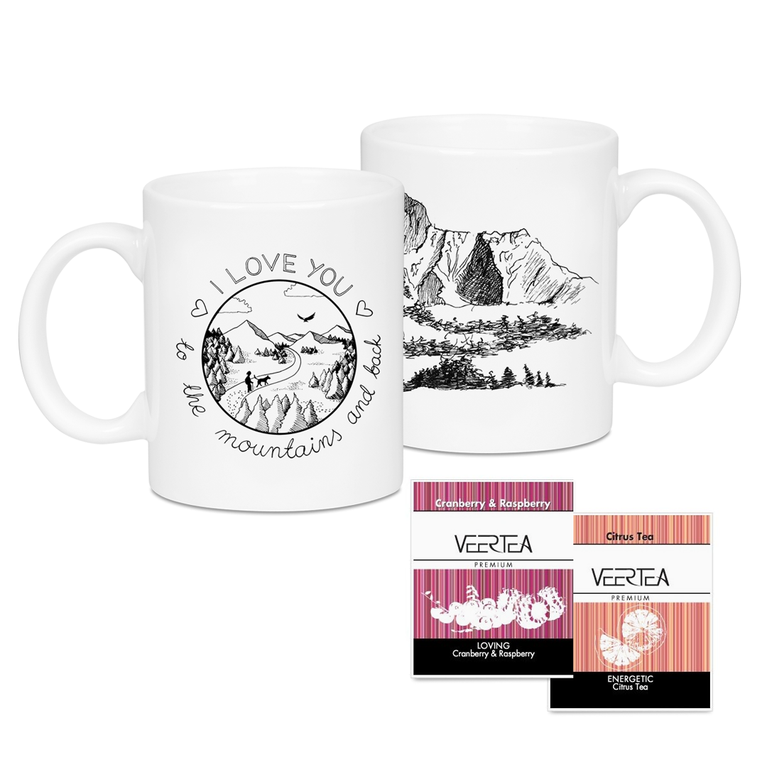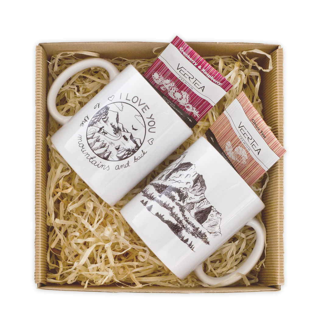 Zestaw prezentowy składający się z dwóch kubków ceramicznych oraz 2 saszetek herbaty Vertea Premium. Uroczy upominek dla par kochających góry. Kubek ceramiczny "I love you to the mountains and back", z przepiękną ilustracją oraz sympatycznym napisem, z pewnością przypadnie do gustu płci pięknej. Surowy, wyrazisty rysunek gór na drugim z kubków zdecydowanie będzie pasował do mężczyzn, uwielbiających outdoor, wspinaczkę i wędrowanie.